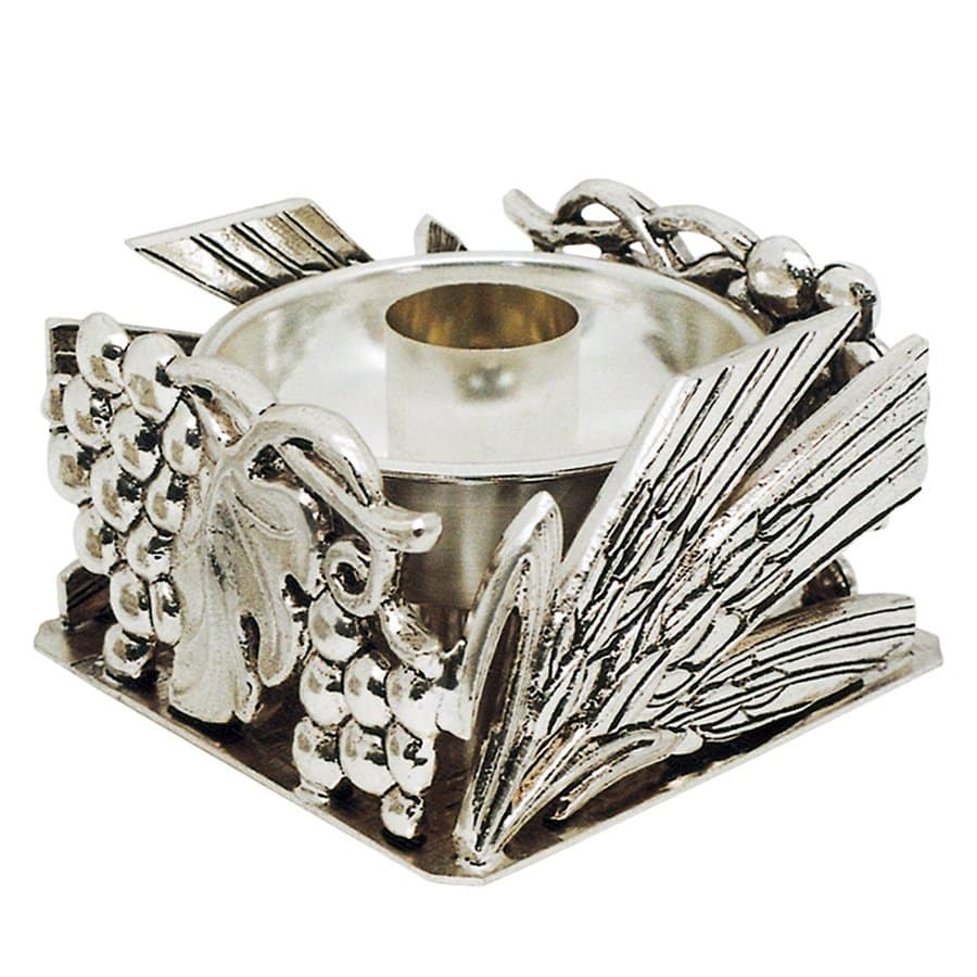 Square brass candlestick with castings representing vine-shoots and wheat.