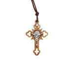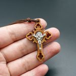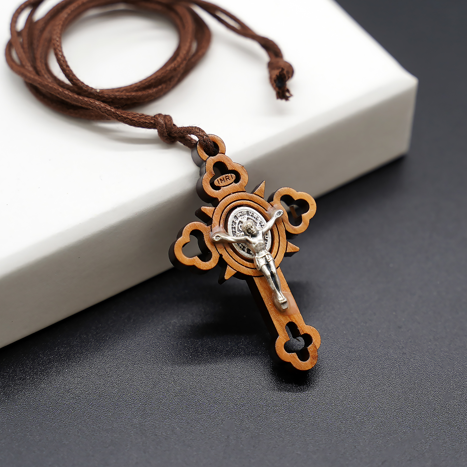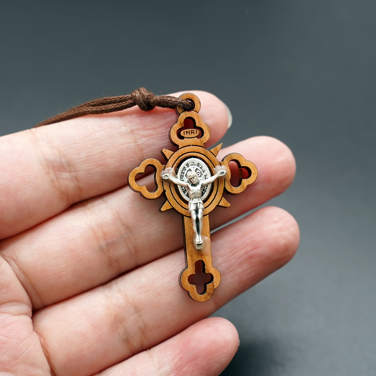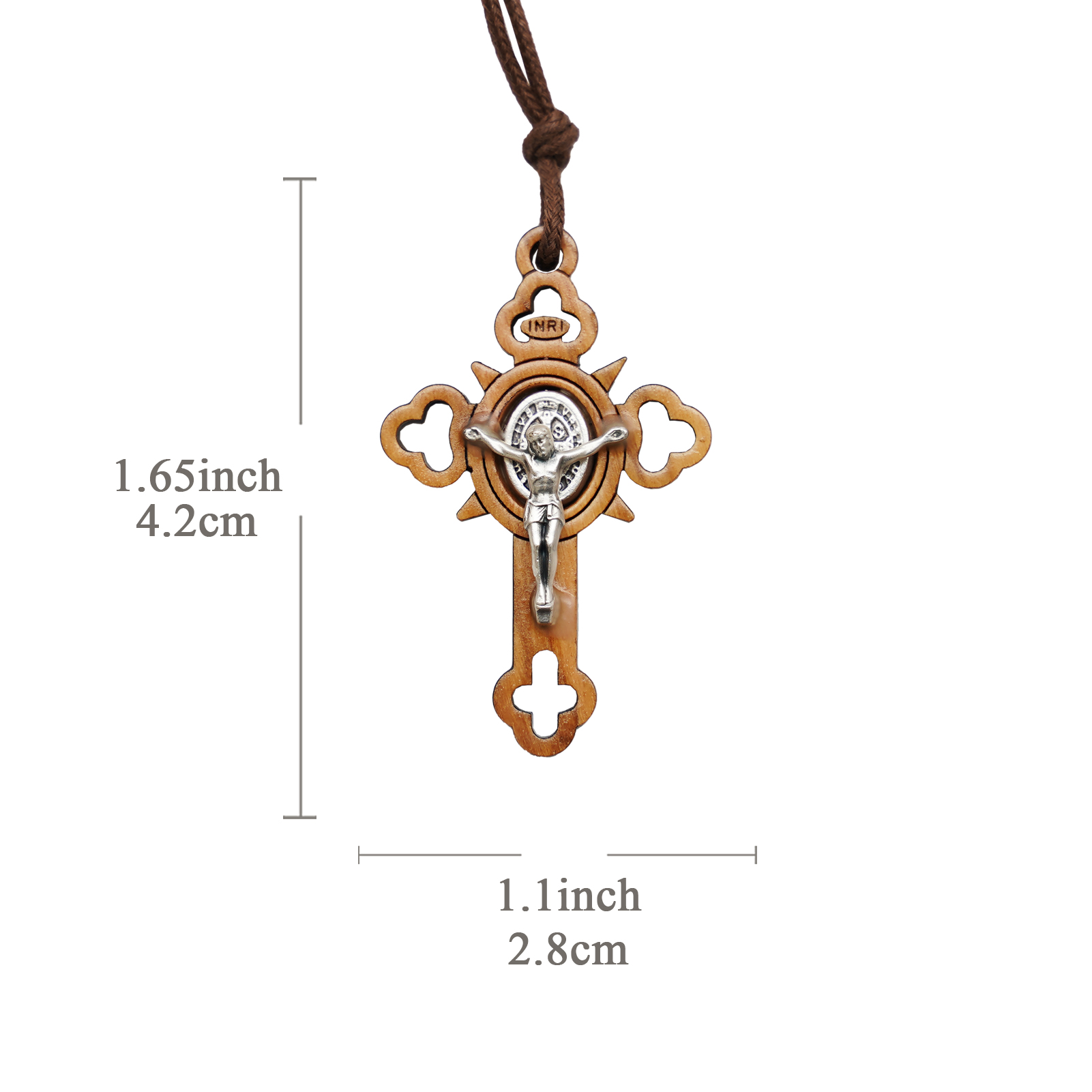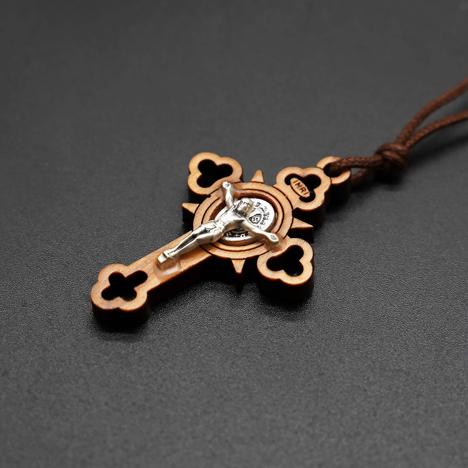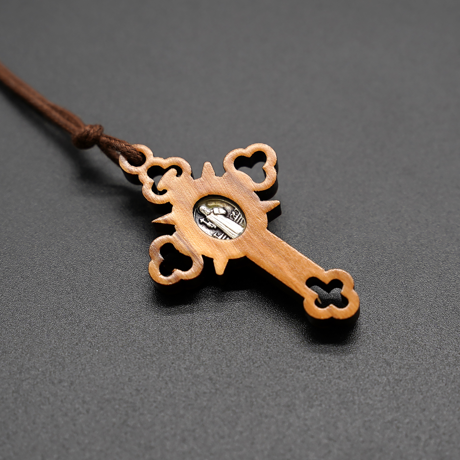 十字架-圣本笃-橄榄木-穿孔设计-椭圆圣牌-带挂绳-4.2×2.8cm