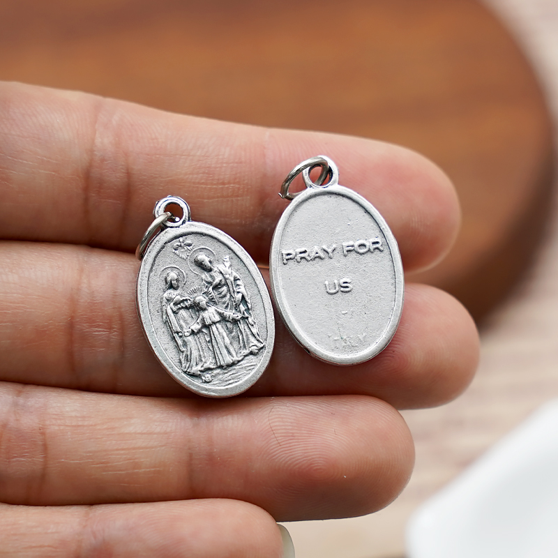 This St. Family Catholic sacred medal is a beautiful accessory for DIY rosary making. Made in Italy and silver-plated with an alloy, this medal measures 2.2 cm in height. It features intricate details and is perfect for adding a touch of religious symbolism to your homemade rosaries.