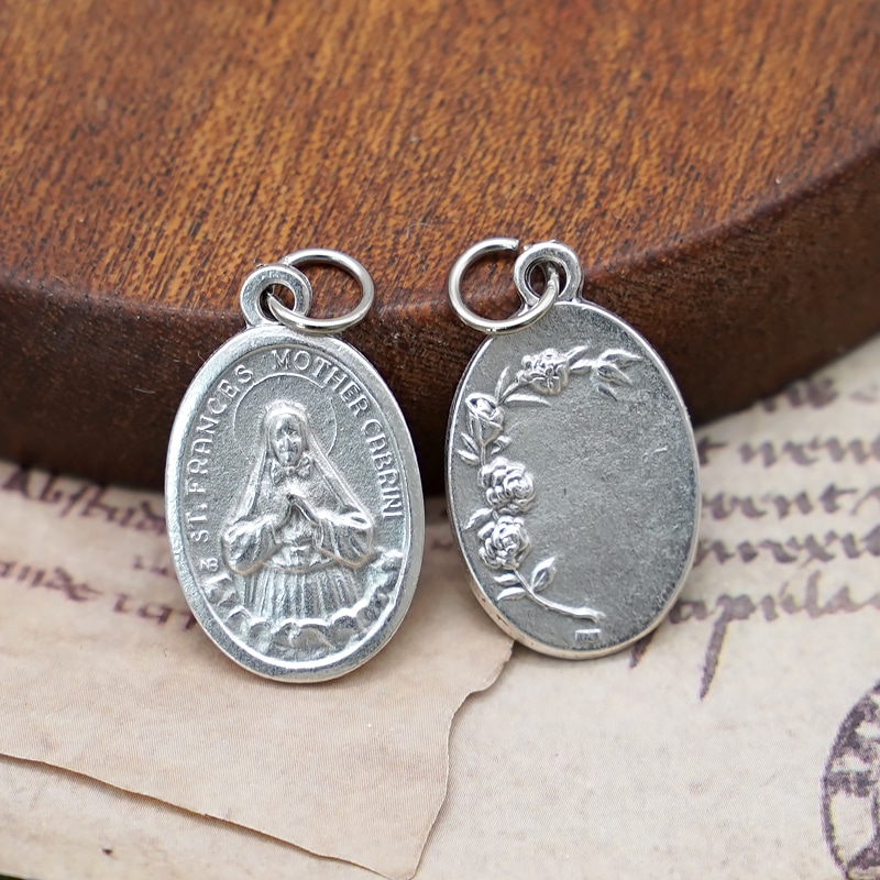 DIY小吊牌-圣方济斯嘉·卡布里尼+玫瑰花-锌合金-镀银-2.2cm