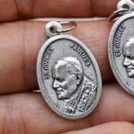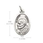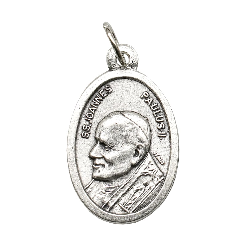 Silver plated St. John Paul II medal, 2.2 cm with jump ring for easy attachment to chain or bracelet.