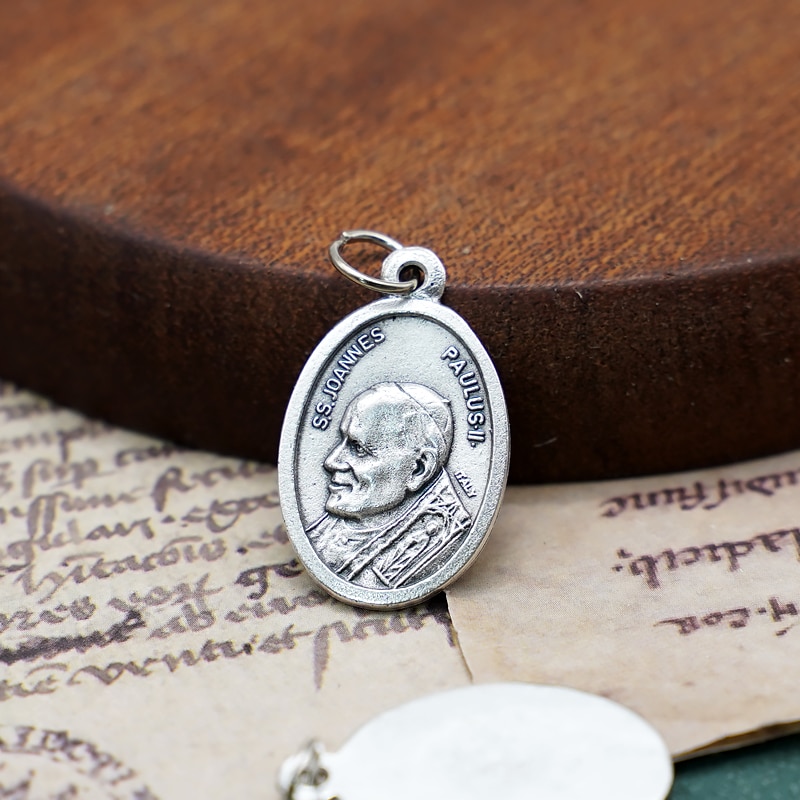 This silver plated medal features the image of St. John Paul II, the beloved Pope who served the Catholic Church for over 26 years. Measuring 2.2 cm, this medal is a beautiful reminder of his legacy and a meaningful spiritual gift for any Catholic. The medal comes with a jump ring for easy attachment to a chain or bracelet.