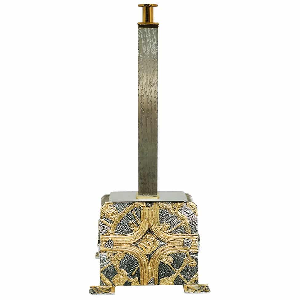 Two-tone stand for crosses with golden sunburst cross on the silvered background.