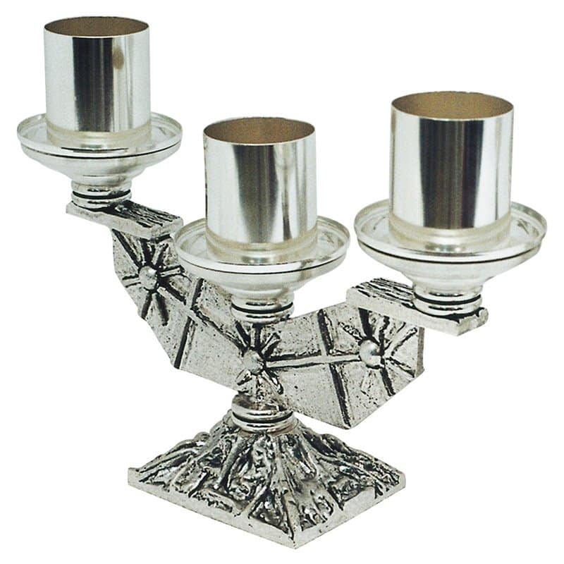Stylized brass candelabrum with three branches with ornamentaion in relief, shaped as sylized crosses and stars.