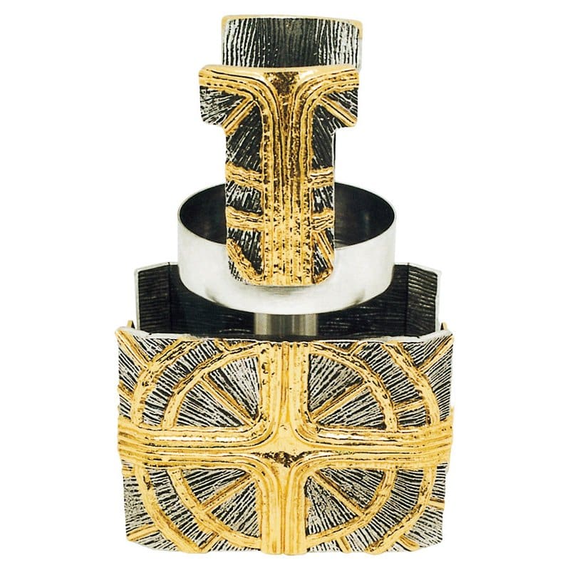 Two-tone table lamp. Golden sunburst crosses on silver background adorn the lamp socket and frame.