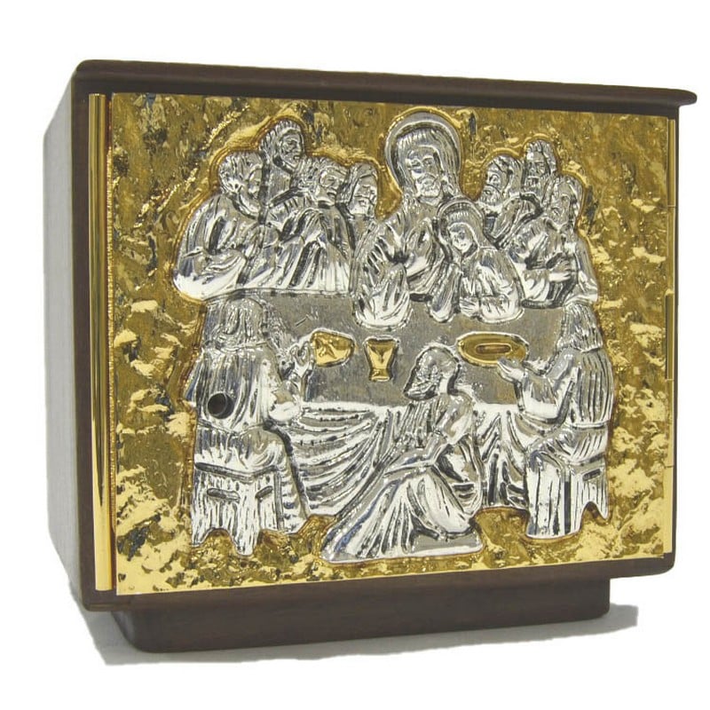 木制桌面圣体龛,双色黄铜铸造门(银/金),内饰24K金色,尺寸(宽x高x深)21x18x18厘米