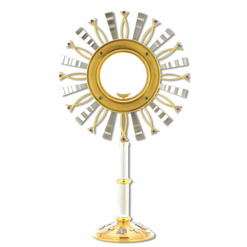 This monstrance for the catholic liturgy is totally realized in two-tone brass. Particular in this outstanding monstrance is the base: it is minutely adorned with images of the four Evangelists and with silver-plated crosses standing out from the gilded background. Also, the supporting pole is silver-plated and presents vertical groovings. The huge shrine is decorated and beautified with a gilded sunburst adorned with four green stones. Blue stones are placed all around the sunburst and are sustained by a circular framework.