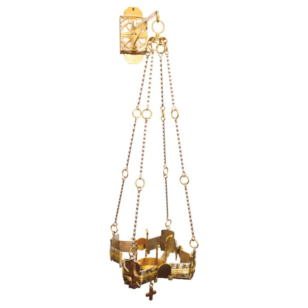 Two-tone wall lamp with chains and frame. Golden sunburst on silvered background adorn frame and lamp socket.
