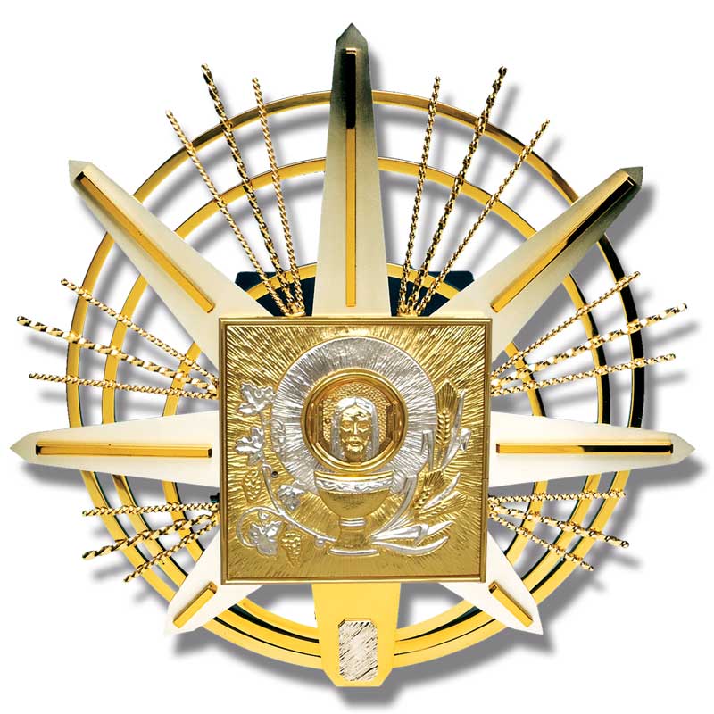 This wall tabernacle where is put the Blessed Sacrament during the catholic liturgy is totally realized in two-tone brass casting and it is a sacred item conceived and made in our workshop by craftsmen. The squared door is adorned by a decoration representing the Holy Communion: The face of Christ in the center is surrounded by spikes, grapes, and a chalice. A geometrical sunburst decore the door. Door provided with security lock.
