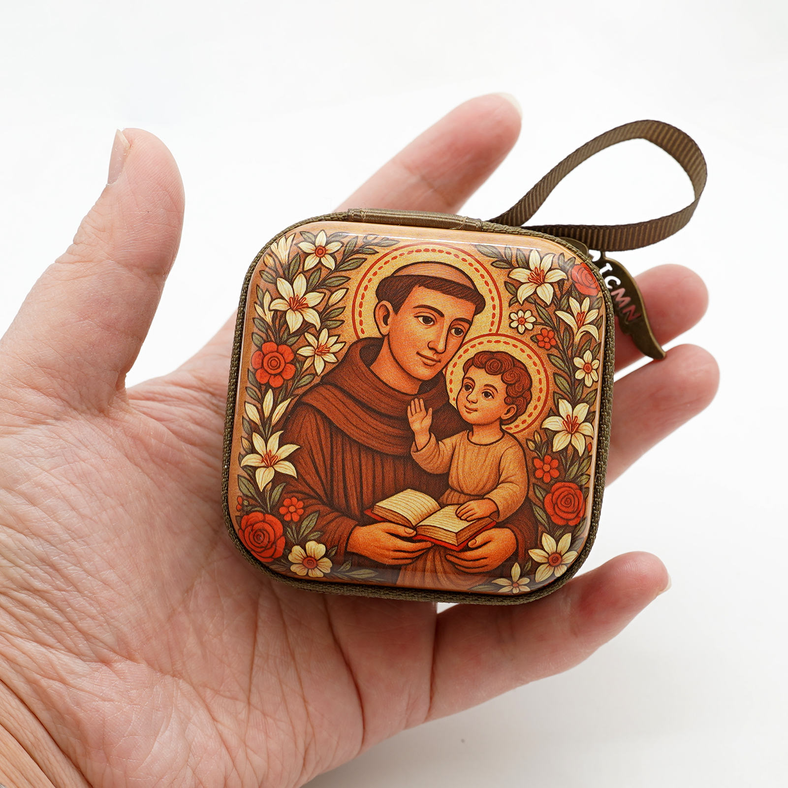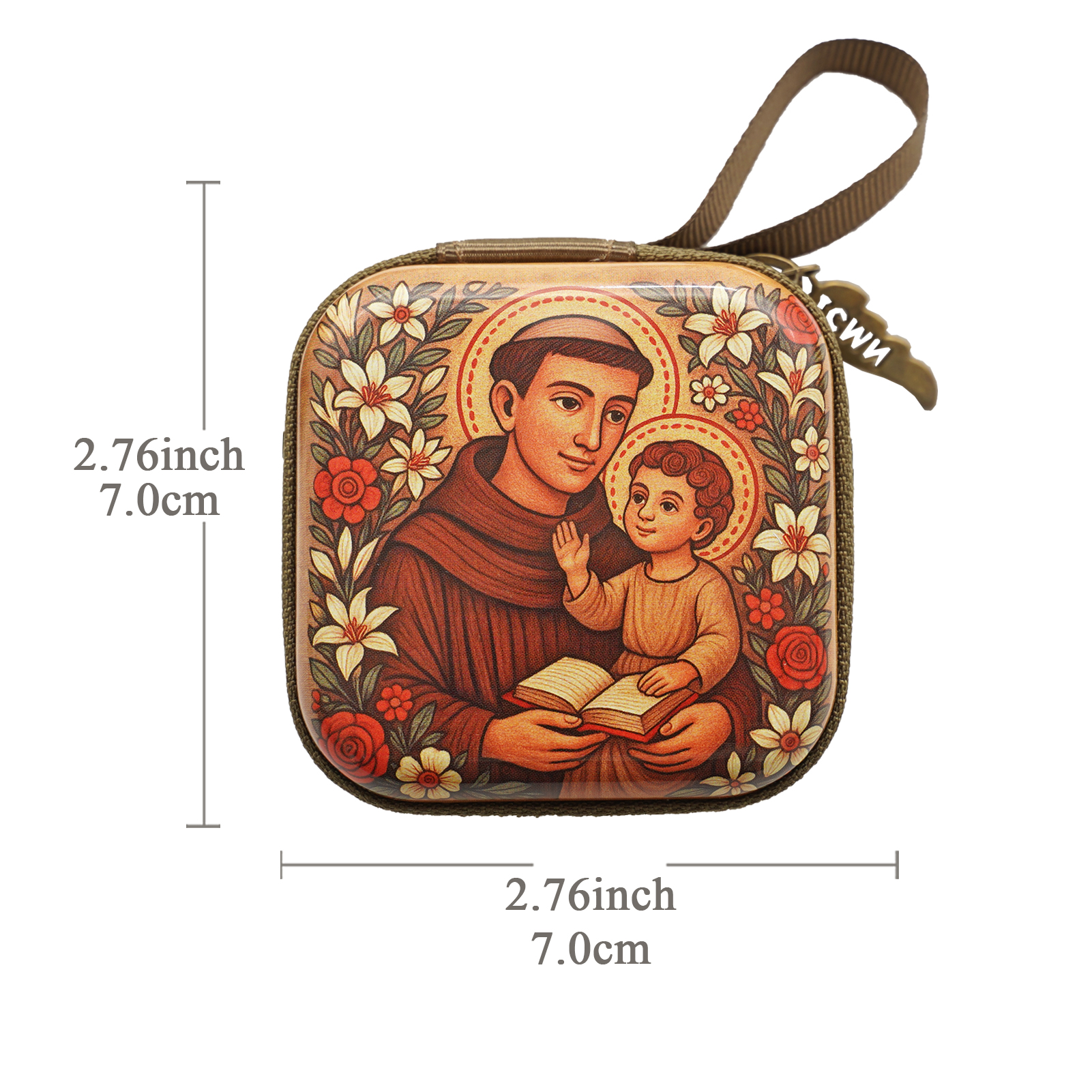 Metal Rosary Case – St. Anthony of Padua – Metal – Zipper -7x7x3.3cm